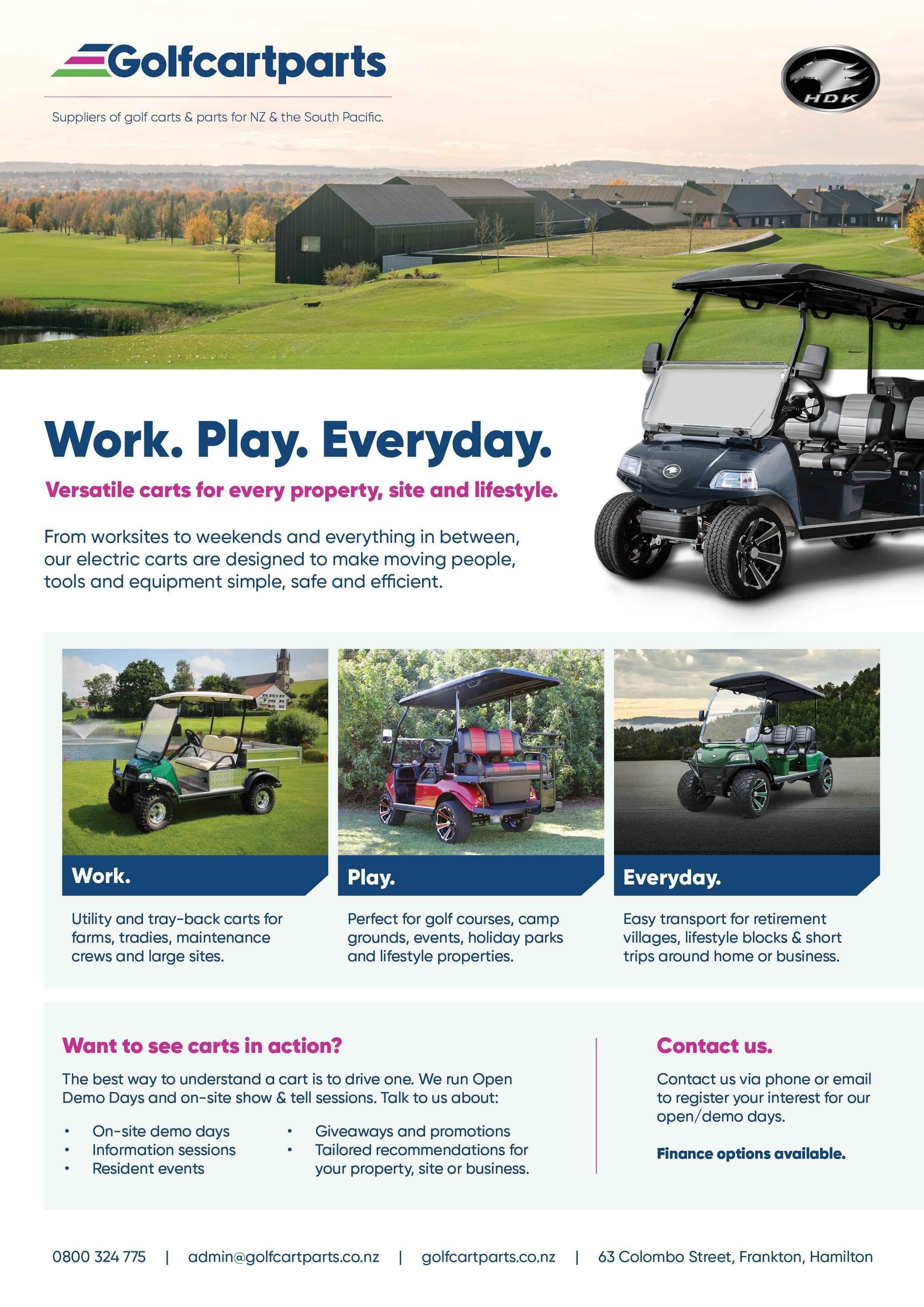 We focus on electric carts that work in the real world, whether that's for commercial sites, schools, resorts, lifestyle blocks or everyday property use.